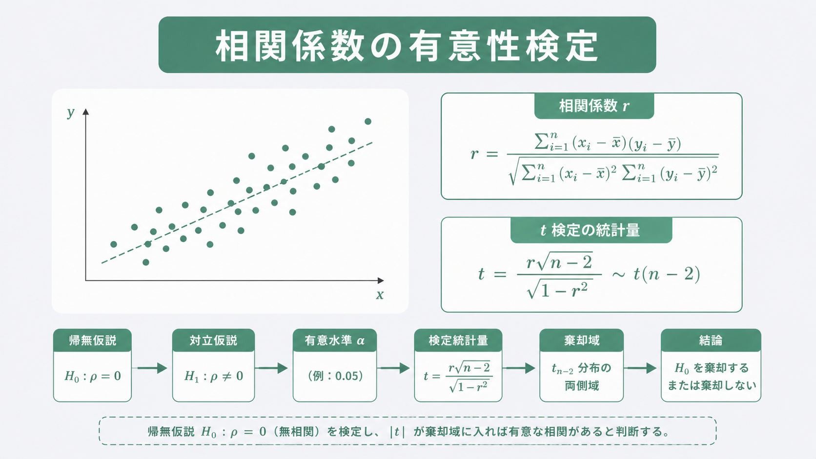「相関がないと仮定したとき、今回得られた r がこれほど大きくなる確率(p値)はどのくらいか?」——これを計算します。p値が有意水準(通常5%)を下回れば、「偶然ではなく、本当に相関がある」と判断します。