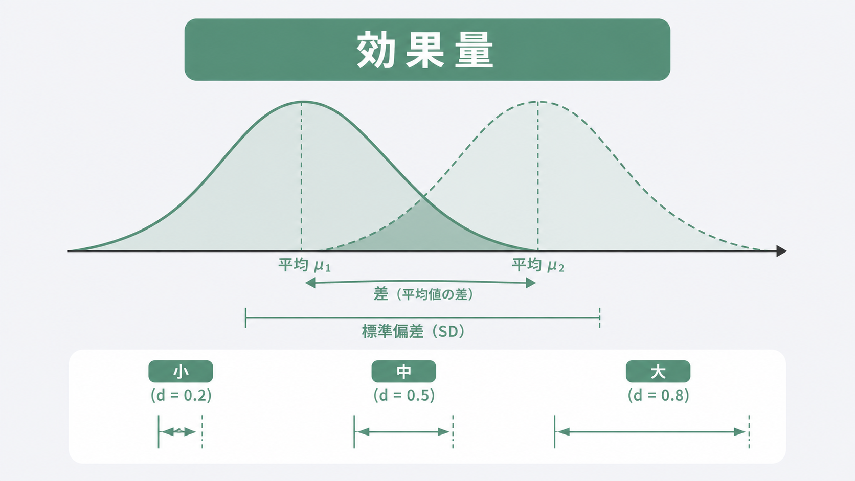 - 効果量は差の「大きさ」を示す指標で、サンプル数の影響を受けない