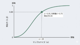 効果量が事前にわかっている(または仮定できる)場合、必要なサンプルサイズを逆算できます。Cohen’s d=0.5(中程度)の差をα=0.05、検出力80%で検出するには、各群n≒34が必要です(両側検定)。
