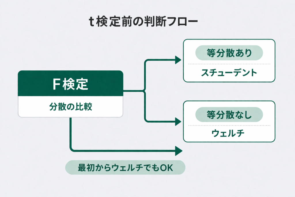 ただし、最初からウェルチのt検定を使う(等分散を仮定しない)方針にすれば、F検定のステップを省略することもできます。スチューデントのt検定はウェルチのt検定の特殊ケースなので、「常にウェルチを使う」というシンプルな運用も実務では多く見られます。