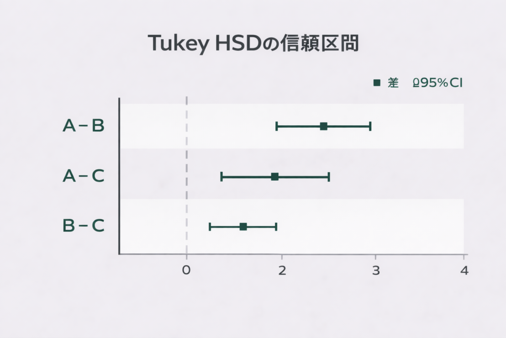 | Tukey HSD | 全ペア比較に特化。検出力のバランスが良い | 全グループを等しく比較したいとき |