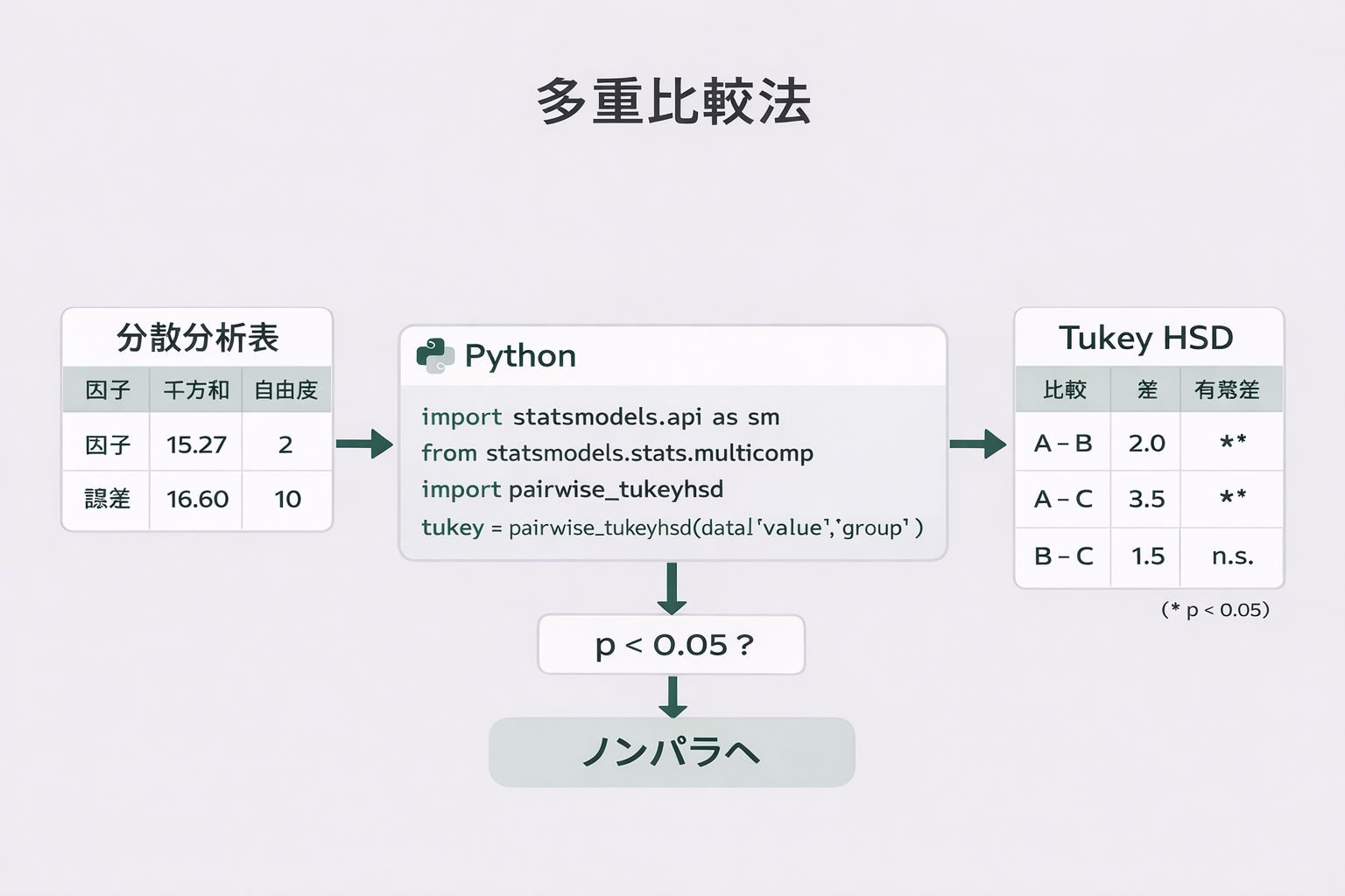 Excelでは多重比較法の専用機能がないため、Tukey HSDの計算にはTukeyのHSD法を例題で解説で紹介している手動計算が必要です。Pythonならコード数行で自動化できる点が大きな違いです。