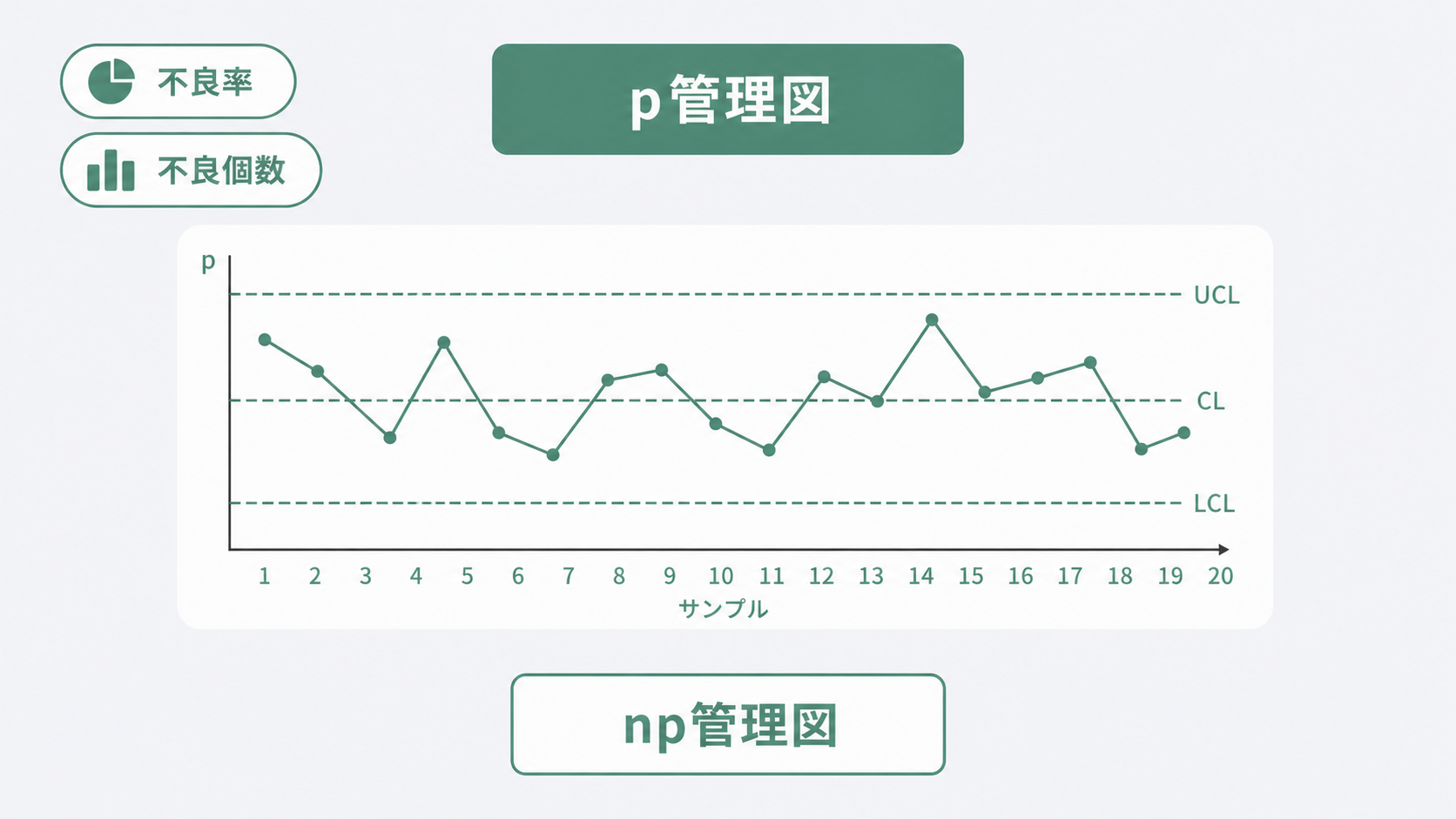管理図には大きく2種類あります。寸法・重量・強度といった連続した数値を扱う「計量値管理図」(X-R管理図など)と、不良個数や不良率のように「合格/不合格」で分類したデータを扱う「計数値管理図」です。p管理図とnp管理図は、どちらも計数値管理図に分類されます。