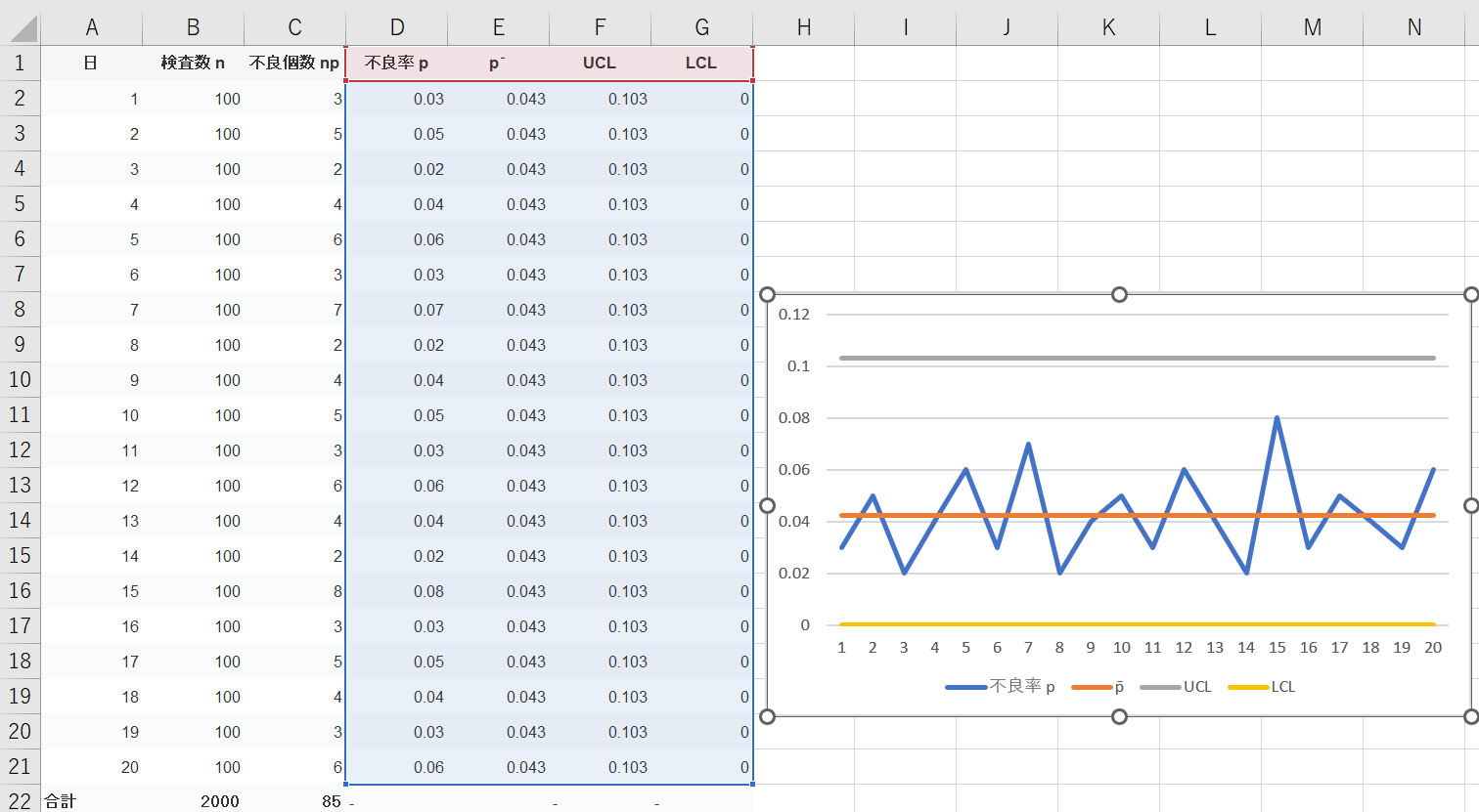 全期間の不良個数の合計を、全検査数の合計で割ります。\[ \bar{p} = \frac{\sum np}{\sum n} = \frac{85}{2000} = 0.0425 \]