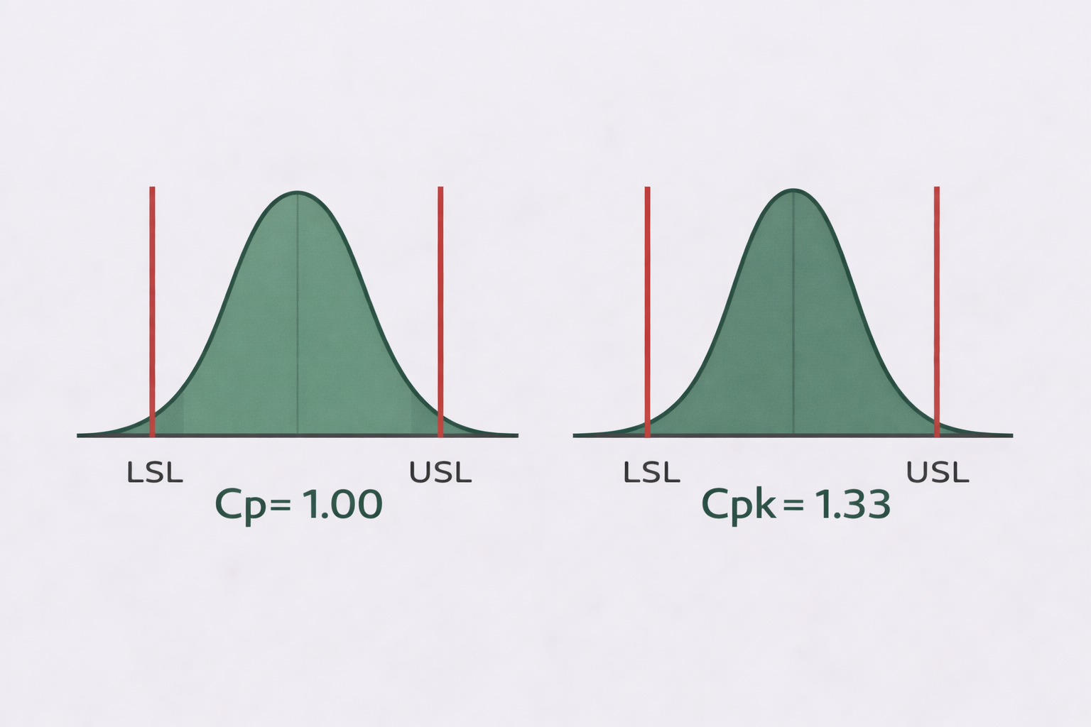 たとえば分布全体が規格中央からずれていると、Cp は高くても Cpk は低くなります。「ばらつきは小さいが、中心がずれている」工程を見抜けるのが Cpk の強みです。