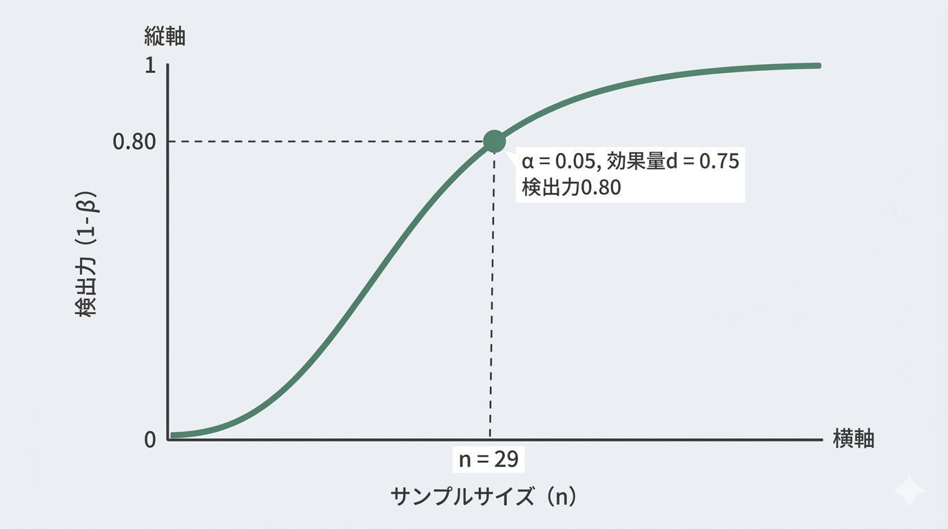 • 検出力(1-β):実際に効果がある場合にそれを検出できる確率。通常は0.80や0.90を目指す