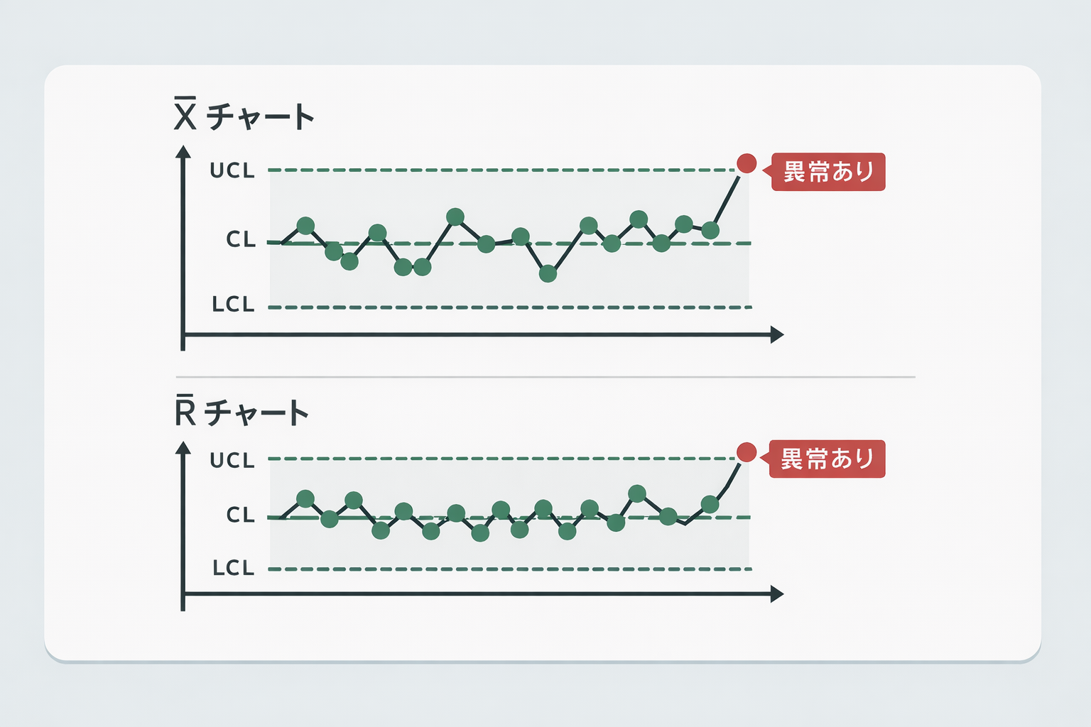 X-R管理図は、工程の平均値(X̄)と範囲(R)の2つのグラフで、工程が統計的に安定しているかを監視する手法です。